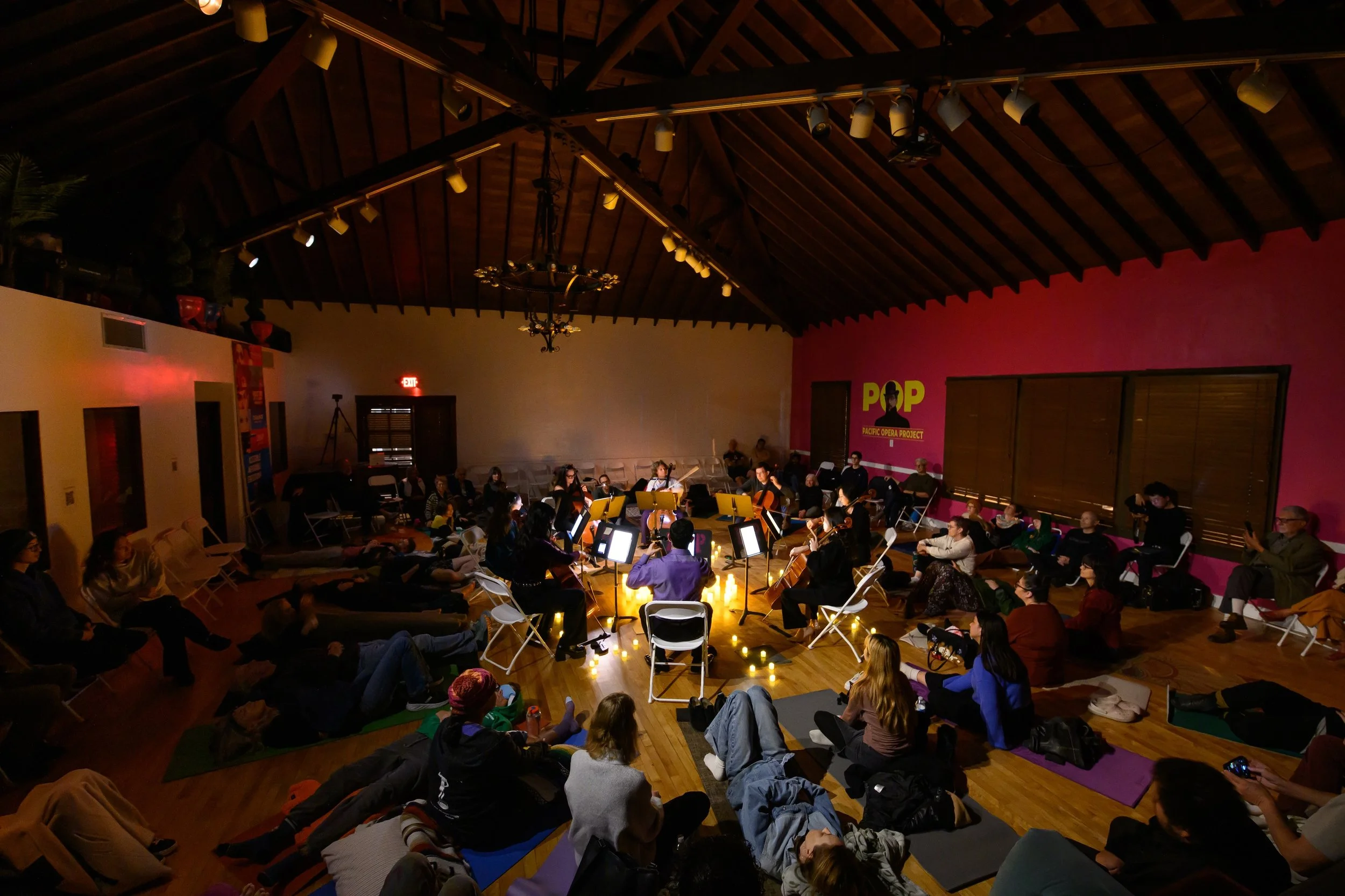 Lie down, stretch and bask in the grounding sound wave of cellos and warm glow of candlelight